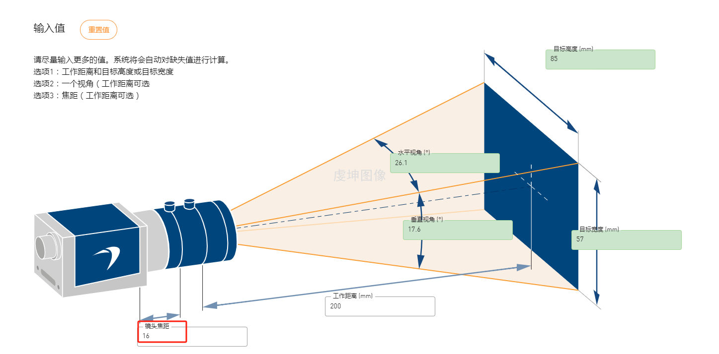 利用公式计算出大致的焦距f,然后选择最接近的标准焦距镜头(如8mm, 12mm, 16mm, 25mm, 35mm, 50mm等)。