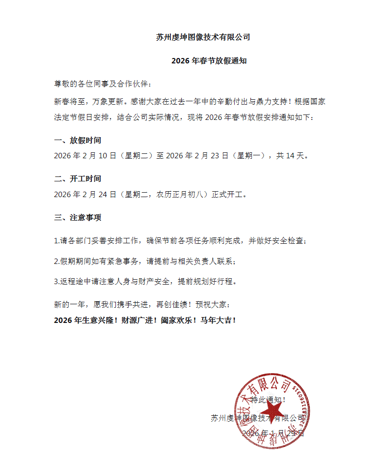 苏州虔坤图像技术有限公司2026年春节放假通知!
